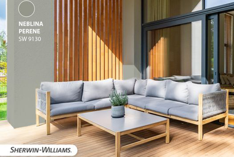 - A Sherwin-Williams estabelece como desafio anual a definição de uma cor. A que marca 2022 é a “Neblina Perene”, com inspiração calma e refrescante, permitindo grande qualidade e versatilidade. Pode ser usada em detalhes do ambiente ou em paredes contrastantes com outras mais claras. Também permite a facilidade de aplicação em ambientes externos, dando o ar sofisticado de dentro da casa para fora.