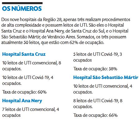 A primeira questão que deve ser respondida é sobre a quantidade de leitos de UTI disponíveis na região. Segundo a coordenadora-adjunta da 13ª Coordenadoria Regional de Saúde, Aline Lima, a Região 28, que inclui Santa Cruz do Sul e outros 12 municípios do Vale do Rio Pardo, possui hoje 50 leitos de UTI, divididos entre os hospitais Santa Cruz (HSC) e Ana Nery, de Santa Cruz do Sul, e São Sebastião Mártir (HSSM), de Venâncio Aires. Destes, 23 leitos são exclusivos para internação de pacientes confirmados com Covid-19 que, por necessitarem de isolamento, não ocupam os demais leitos de UTI não exclusivos.