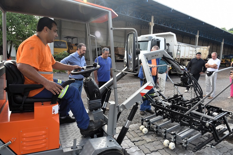 Em visita à Secretaria de Obras e Infraestrutura na manhã de quinta-feira, 27, o prefeito Sérgio Moraes, e o vice, Alex Knak, acompanharam o funcionamento de uma máquina pavimentadora para assentar blocos de concreto, também chamados de bloquetes. O equipamento, que está em fase de testes, foi adquirido ainda em 2020, ao valor de R$ 428 mil, mas não estava sendo utilizado.