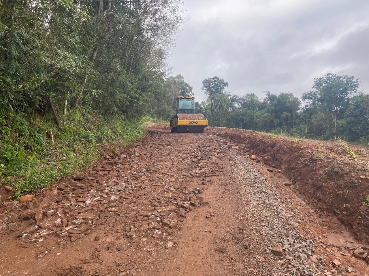 Nesta semana, equipes estão operando na recuperação e manutenção da estrada de Linha Harmonia da Costa até Linha Olavo Bilac, onde surgiram atoladores, conhecidos como “borrachudos”. Nesses pontos, é colocado material e finalizado com rolo compactador. Ainda, é executada a abertura de valetas e a colocação de canos, além da limpeza das vias.