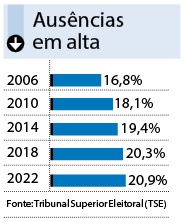 Pela Constituição, o alistamento eleitoral e o voto só são facultativos para pessoas com idades entre 16 e 18 anos, acima de 70 anos e analfabetos. No primeiro turno, o índice de abstenção chegou a 20,9%. Dados do Tribunal Superior Eleitoral (TSE) mostram que esse percentual vem crescendo desde 2006 (veja quadro). Em algumas regiões, as ausências foram ainda maiores.