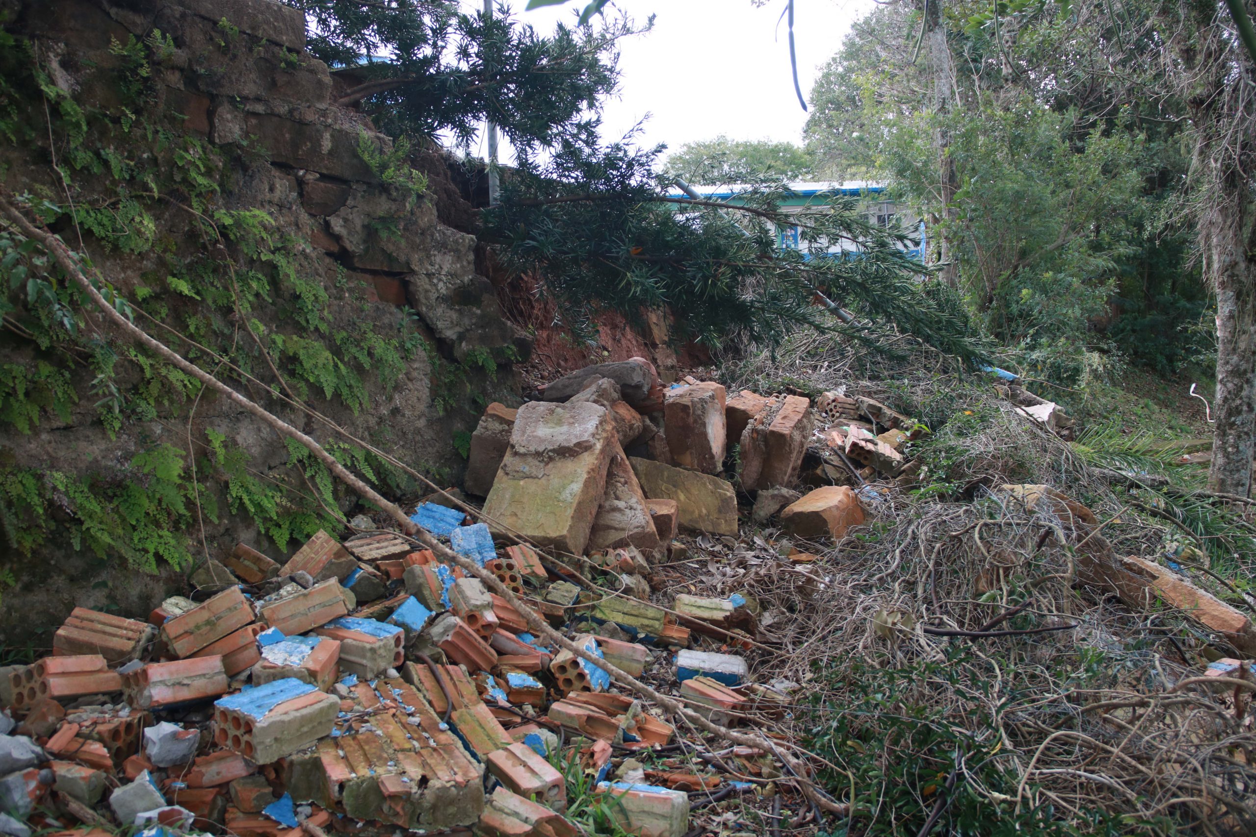 Pedaços do muro que caiu durante o temporal de janeiro ainda estão no local