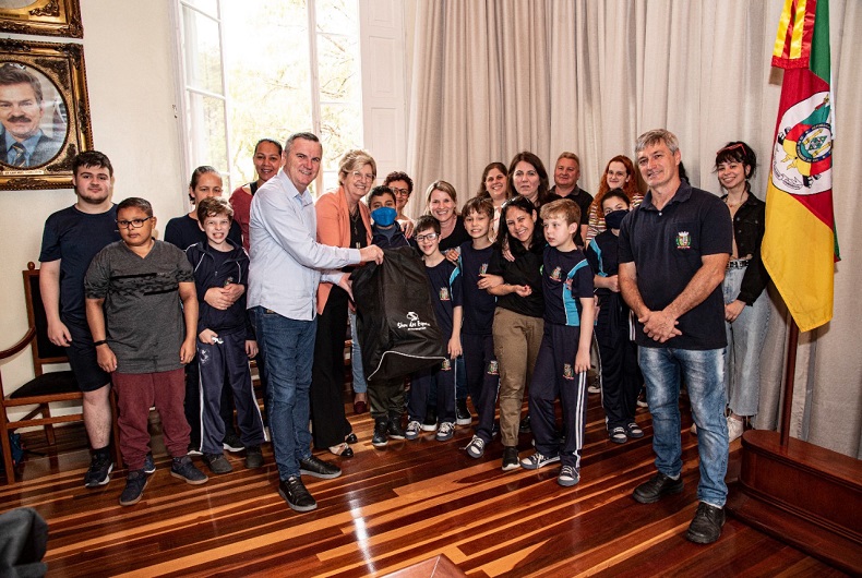 Em ato no Salão Nobre do Palacinho nessa sexta-feira, 9, alunos de seis escolas da rede municipal, participantes da nona edição dos Jogos Municipais de Inclusão, foram recebidos pela prefeita Helena Hermany e o vice Elstor Desbessell. O encontro teve como objetivo a distribuição de kits esportivos para três educandários, conforme classificação pelo número de curtidas e compartilhamentos de vídeos elaborados pelas instituições. São elas as Emefs Guilherme Hildebrand, Duque de Caxias e Leonel de Moura Brizola.