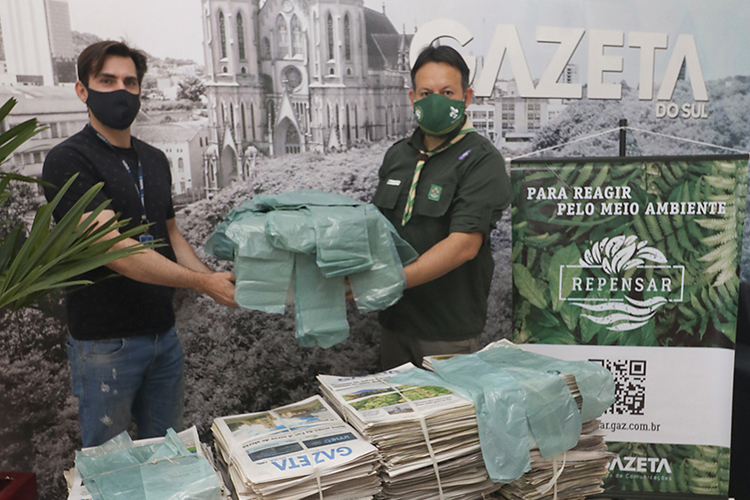 O Grupo Escoteiro Santa Cruz 181-RS entregou na manhã de ontem mais de mil sacos plásticos que são utilizados para envolver os jornais. A entrega foi feita pelo presidente da entidade, Fábio Roberto Azevedo, ao gerente de Produto e Inovação da Gazeta, Eduardo Dalla Costa, na Casa de Clientes. A iniciativa faz parte do projeto Repensar da Gazeta Grupo de Comunicações, que em setembro lançou uma campanha de logística inversa. O foco é no retorno de materiais já utilizados no processo produtivo, visando o reaproveitamento ou descarte apropriado de jornais usados e sacos plásticos.