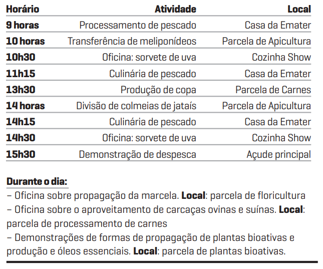 O público que visita o parque nesta quarta-feira, 25, encontra 16 atividades práticas distribuídas em 19 parcelas temáticas. Entre os destaques estão as oficinas na Cozinha Show, que ensinam a produção de sorvete de uva em dois horários (10h30 e 14h30), e as demonstrações de manejo de pescado, que abrangem desde a qualidade da água até a culinária.