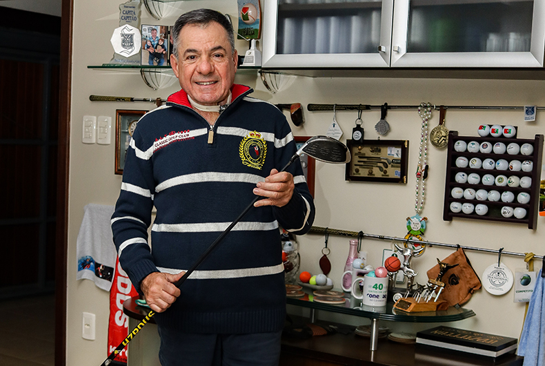 Nascido em Santiago e radicado em Santa Cruz do Sul desde 1980, o médico e empresário Paulo Renato Jornada Krebs, de 67 anos, pai da Carmela e do Amadeu e vovô da Rafa, do Felipe e do Henrique, sempre teve boa desenvoltura para os esportes, entre eles tênis, atletismo e futebol, mas foi no golfe que ele encontrou algo a mais. Depois de anos praticando esse esporte e inclusive sendo presidente do Santa Cruz Country Club por três vezes, ele se viu apaixonado por guardar lembranças de suas viagens e jogos que o esporte lhe proporcionou.