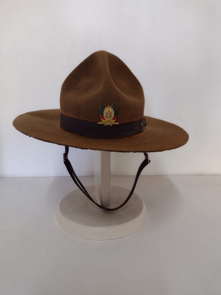 Observando bem de pertinho, tem capacete inclusive com marca de tiros, provavelmente o que salvou o soldado na época. Savian também é um estudioso sobre o assunto, e um dos itens em destaque é o chapéu de aba larga, que pertenceu a uma das primeiras tropas de elite da Brigada Militar na década de 1950 e foi inspirado nas vestimentas do Canadá.
