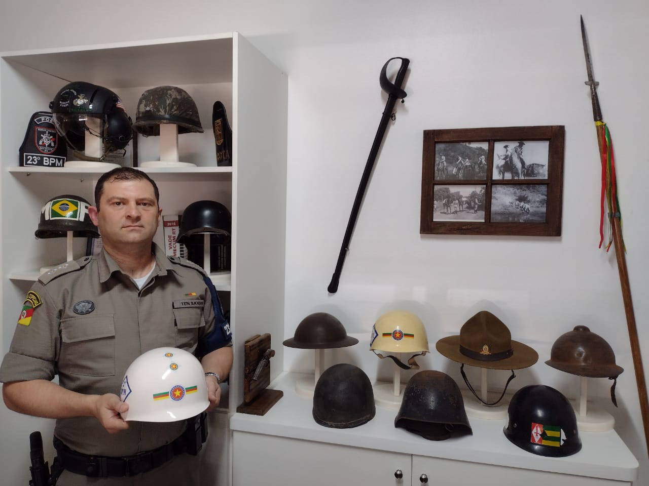 Olá, caros leitores! Espero que tenham tido uma boa virada de ano. E, para iniciar 2022, vamos mostrar uma bela coleção de capacetes. O gosto pelos itens militares começou ainda na infância do colecionador, quando brincava com os soldadinhos da Gulliver com seu irmão. Para Carlos Moisés Savian dos Passos, o tenente Savian, da Brigada Militar, santa-mariense de 43 anos que reside em Santa Cruz do Sul mas é comandante em Vera Cruz, casado com a capitã da Brigada Militar Michele da Silva Vargas, pai do João e da Júlia, foi questão de tempo para se tornar um colecionador de itens militares, em especial os capacetes.