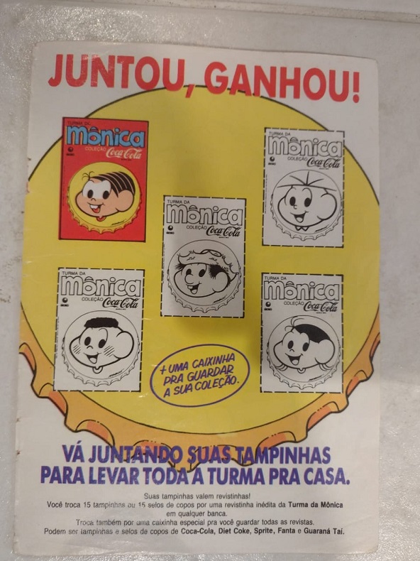 Quem já não leu um gibi da Turma da Mônica? Lá nos anos 1990, a Coca-Cola deu mais uma forcinha para a garotada e lançou uma promoção bem cultural. Para levar toda a turminha, bastava você juntar 15 tampinhas da promoção ou 15 selos de copos e trocar por uma revistinha inédita da Turma da Mônica em qualquer banca. E depois de completar a coleção, que tinha a Mônica, o Cebolinha, a Magali, o Cascão e o Chico Bento, você ainda podia trocar as tampinhas por uma caixinha especial para guardar todas as revistas.