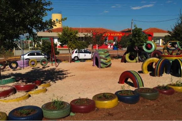 A Secretaria Municipal da Educação de Estrela Velha construiu junto ao estacionamento do Centro Administrativo Municipal, que fica em frente a Emei, uma praça com areia e brinquedos de pneus e ornamentado com flores e arborização.