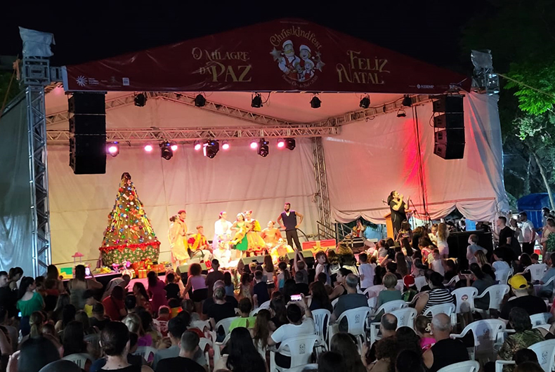 A cerimônia de abertura da Christkindfest emocionou a multidão que foi até a Praça Getúlio Vargas na noite desta sexta-feira, 1º. O evento começou com a peça teatral Natal Mágico, que encantou, sobretudo, o grande público infantil com atuações, música e interação dos artistas com a plateia.