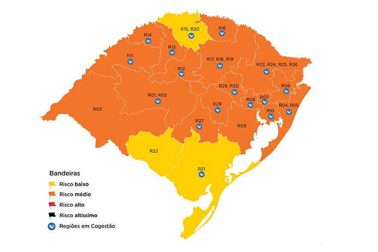 A melhora de indicadores tem sido verificada nas últimas três rodadas. Na 21ª, todas as 21 regiões foram classificadas em laranja, e na 22ª, somente a região Covid de Santa Maria ficou em bandeira vermelha. A 23ª rodada, por sua vez, traz três regiões em bandeira amarela e 18 em bandeira laranja. Dos 497 municípios gaúchos, 284 não apresentaram registro de hospitalizações e óbitos por Covid-19 nos últimos 14 dias.