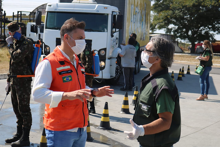Prefeito Divaldo Lara (E) em um dos pontos de desinfecção criados pela Prefeitura, para tentar conter o coronavírus no município | Foto: Vitor Garcia