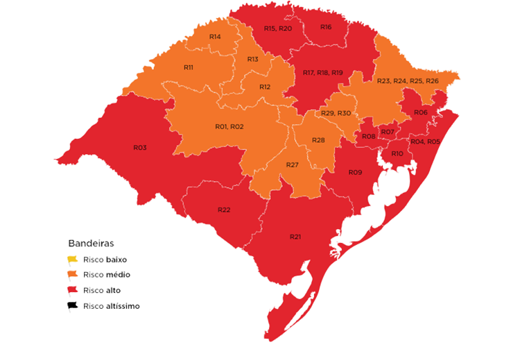 As 12 regiões preliminarmente classificadas com risco alto para o contágio por coronavírus são Guaíba, Capão da Canoa, Palmeira das Missões, Erechim, Pelotas, Bagé e Uruguaiana, Novo Hamburgo, Porto Alegre, Canoas, Taquara e Passo Fundo.