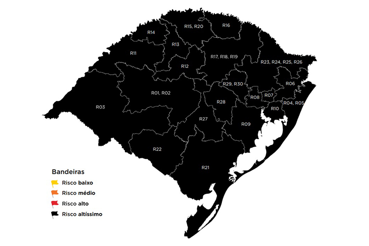 O Rio Grande do Sul está todo preto no sistema desde 27 de fevereiro, quando foi criada a salvaguarda estadual que garante a aplicação automática da bandeira mais grave a todas as regiões quando a capacidade hospitalar está próxima do limite. Como há risco de as equipes de saúde estarem sobrecarregadas e de haver atraso no preenchimento dos dados, o Gabinete de Crise determinou que quando a razão de leitos livres de UTI sobre leitos ocupados por Covid em UTI estiver menor ou igual a 0,35 a nível estadual, a salvaguarda será acionada, e se sobrepõe à média ponderada dos indicadores regionais.