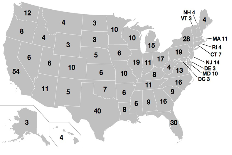 Cada uma das 50 unidades tem uma série de representantes, de acordo com a população. A Califórnia detém o maior número, 54; Dakota do Norte, Delaware, Dakota do Sul, Vermont, Wyoming, Distrito de Columbia e Alasca são os que contam com menor: três em cada. Exceto Maine e Nebraska, os outros utilizam o sistema “the winner takes it all”, pelo qual quem vence no estado leva todos os delegados.