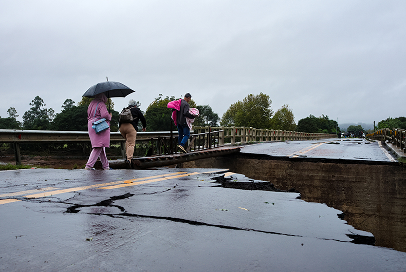Sem comunicação, energia elétrica e comida, os moradores improvisaram nessa sexta-feira uma ponte em madeira para que as pessoas de Linha do Rio acessassem a cidade e abrigos. Para chegar ao local, eles caminham quase 2 quilômetros até o ponto, pela via bloqueada. No entanto, não há monitoramento seguro dessa situação e os cidadãos colocam as vidas em risco.