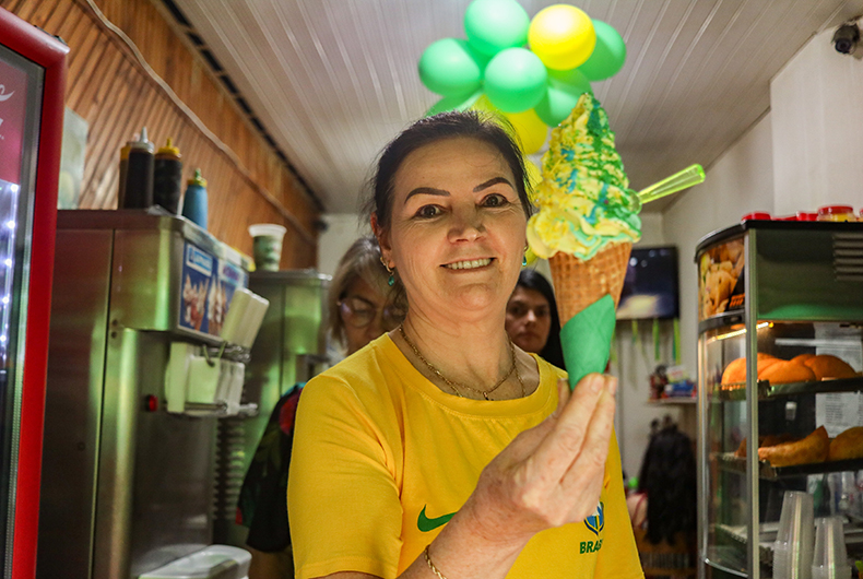 Além das decorações nas lojas e nas ruas, a Copa do Mundo também inspira o desenvolvimento de produtos. Proprietária de uma sorveteria, Renice Grutzmann teve a ideia de criar um sorvete verde e amarelo para vender nos dias de jogos do Brasil. “Minha filha viu a receita na internet e eu entrei em contato com o fornecedor. Felizmente eles conseguiram me entregar rápido”, relatou. Os sabores de morango verde e baunilha amarela são complementados com uma cobertura azul, além de chocolate granulado também verde e amarelo, se o cliente assim desejar.