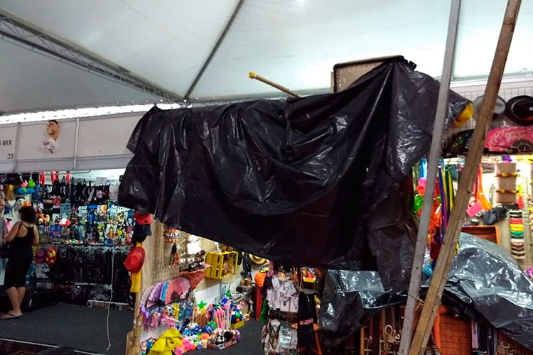 No local, uma pirâmide de sustentação, no teto, acabou cedendo. Os trabalhadores escoraram a estrutura e o local foi bloqueado para a passagem de visitantes. Expositores usaram lonas para cobrir os produtos e evitar que a água danificasse qualquer mercadoria, até que a situação seja consertada. Ninguém ficou ferido.