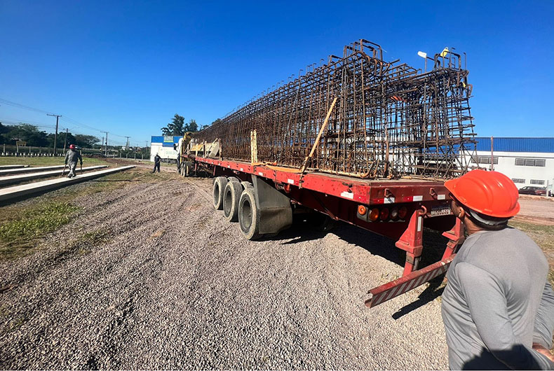 As primeiras armaduras para a fabricação de vigas longarinas que serão utilizadas no Viaduto do Arroio Grande chegaram a Santa Cruz do Sul nessa sexta-feira, 27. O carregamento, vindo de Nova Santa Rita, foi entregue no canteiro avançado de obras do consórcio Giovanella/Porto Beton, vencedor da licitação para a execução da construção, junto ao pátio da Indústria Zuchetto.