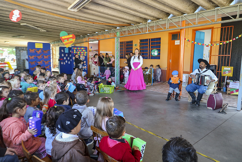 Com cantoria e dança, gaiteiro Lucas Teixeira alegrou os pequenos da Escola de Educação Infantil Raio de Luz