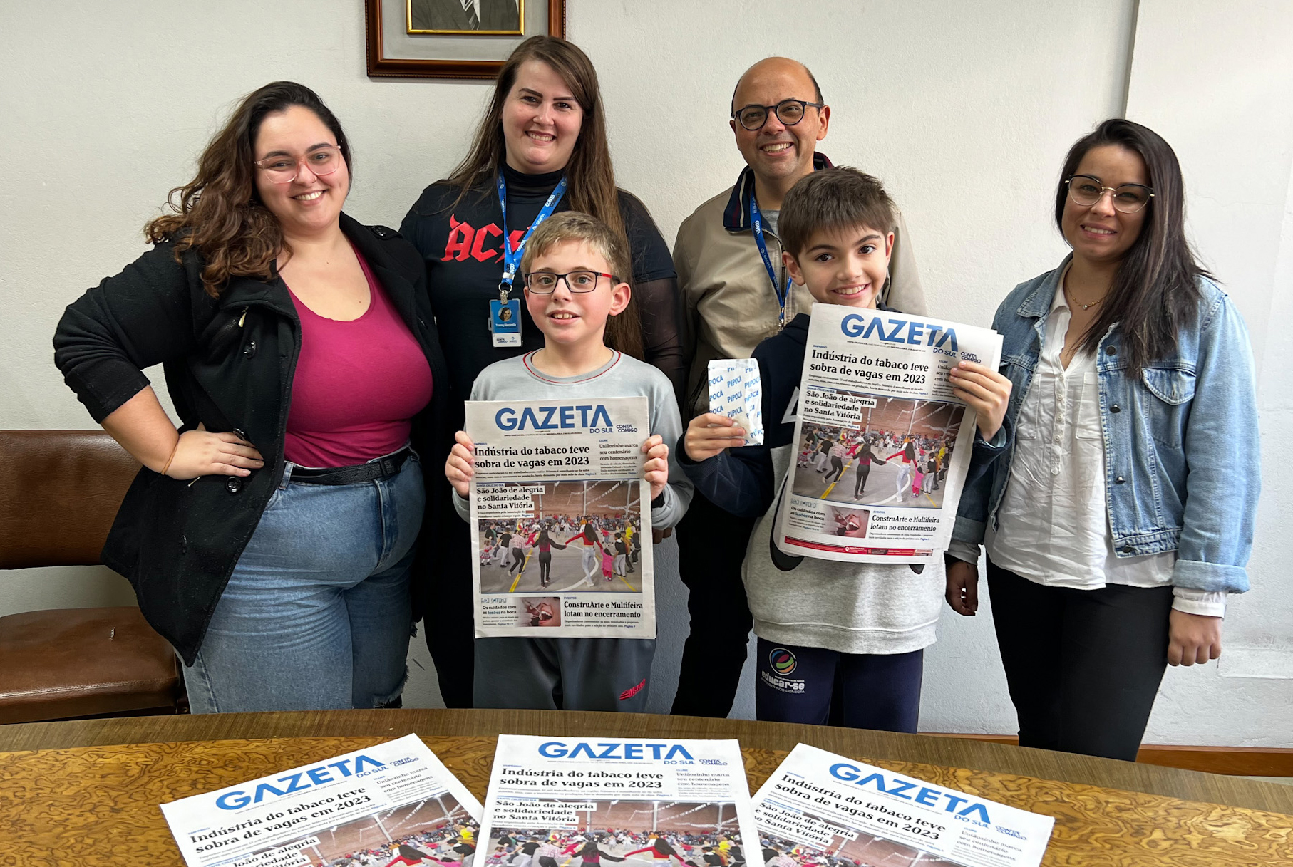 A redação integrada da Gazeta Grupo de Comunicações recebeu uma visita especial no dia 3 de julho. Atentos às notícias publicadas tanto no jornal impresso quanto nas plataformas digitais, os estudantes Matheus Cardoso de Oliveira e Arthur Francisco Sehn de Bello, ambos de 11 anos, foram recepcionados pelos editores-executivos Dejair Machado e Heloísa Corrêa; a editora multimídia do Portal Gaz Naiara Beatriz Silveira Brasil e a coordenadora de marketing do grupo, Tuanny Giovanella.