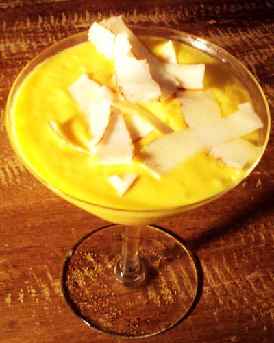 Preparo: bata o creme de leite com o açúcar e o gengibre com a batedeira até formar um creme consistente. Em um liquidificador bata a manga, o limão e o leite de coco. Misture ambos com cuidado buscando consistência. Coloque o creme preferencialmente em taças e decore com as raspas de coco. Pode-se ainda decorar com folhinhas de hortelã, o que, além da beleza, pode trazer uma ótima refrescância ao creme.