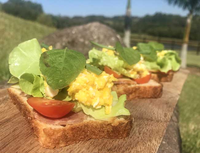Peça ao filho mais velho que prepare uma omelete com os ovos usando uma pitada de pimenta, orégano e sal apenas. Assim que pronto, reservar. O outro filho pode montar as torradas na seguinte ordem: colocar sobre cada fatia de pão regada com um fio de azeite de oliva o queijo, o salamito, o tomate, a alface e a omelete e finalizar com os temperos frescos.