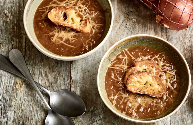 Esta deliciosa sopa que leva cebola como ingrediente principal é um clássico da cozinha francesa e talvez um de seus pratos mais antigos. Como usa cebola – econômica e fácil de cultivar –, tornou-se conhecida como a “sopa dos pobres”. Mas reza a lenda que ela foi criada pelo Rei Luis XV numa noite, em uma de suas caçadas. Cozinheiro como era, descobriu que tinha apenas cebola, manteiga e champanhe. Misturou os poucos ingredientes e criou a primeira sopa de cebola francesa. Tal passagem ganhou a corte e a nobreza e trouxe fama à receita, que ganhou outros ingredientes (caldo de carne, pão, queijo gruyère e outros) e se espalhou pelo mundo, independentemente de ser o prato da realeza ou dos servos. A seguir, a receita da sopa de cebola.