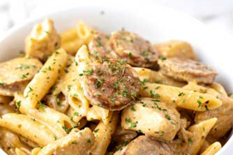 Preparo: em uma panela, adicione o azeite e aqueça, junte a cebola e a linguiça e cozinhe até dourar levemente. Adicione o alho, misture bem e junte o caldo de galinha, o molho de tomate, o creme de leite e tempere. Cozinhe a massa e assim que estiver “al dente”, escorra e junte ao molho. Misture bem em fogo baixo. Desligue, misture metade do queijo e mexa bem. Depois despeje o restante do queijo por cima e cubra a panela por cerca de cinco minutos. Salpique com a cebolinha verde fatiada e sirva!