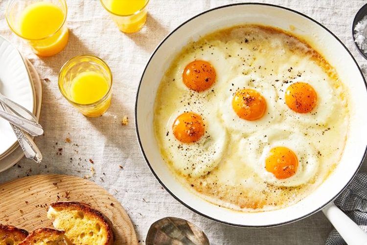 Preparo: Utilize uma frigideira antiaderente que acomode uma tampa de igual diâmetro. Sem aquecer, despeje creme de leite suficiente para formar uma camada fina no fundo da frigideira. Tempere este creme com sal, pimenta e noz-moscada. Ligue o fogo baixo e adicione os ovos, coloque sal sobre eles, aumente o fogo para médio para começar a cozinhar os ovos. O creme vai ferver, parte vai vaporizar e irá caramelizar nas bordas e fundo. Quando as claras estiverem quase firmes e o creme estiver mais grosso, retire a panela do fogo e tampe-a por um minuto para terminar de fixar as claras. A gema ficará firme, mas escorrendo! Sirva em seguida com pães torrados.