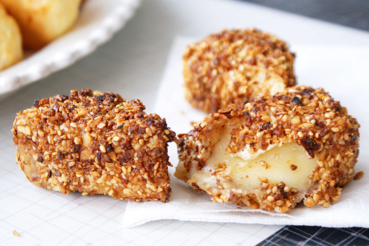 Preparo: para ter o ponto certo do brie, deve-se congelá-lo com antecedência de cerca de duas horas, tirando-o do freezer minutos antes do preparo. Colocar num processador as nozes, as amêndoas, as sementes de gergelim, o tomilho, a pimenta e o sal e processar rapidamente, despejando o preparo num prato raso. Em outro recipiente, misturar o ovo com um garfo.