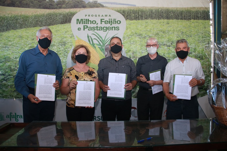 A cerimônia de abertura da colheita e celebração do Dia do Produtor teve, também, a assinatura do termo de cooperação técnica do Programa Milho, Feijão e Pastagens após a Colheita do Tabaco, que é realizado em parceria com o governo gaúcho, por meio da Secretaria da Agricultura. Essa iniciativa de diversificação, além do SindiTabaco, da Afubra e da secretaria, tem a participação de Emater, Fetag e Farsul no incentivo à diversificação e à otimização no aproveitamento dos recursos das propriedades rurais. Tanto o plantio de pastagens quanto o de grãos após a colheita do tabaco permite um melhor aproveitamento da terra. Assinaram o documento a secretária Silvana Covatti, Iro Schünke, Benício Werner, Carlos Joel da Silva e Marco Antônio dos Santos (coordenador regional da Farsul).