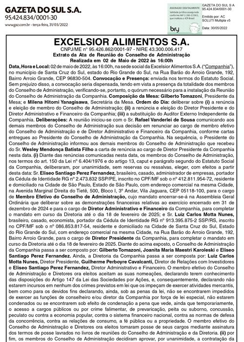 Excelsior Alimentos S.A. – Ata 02 Maio 2022 – Publicidade Legal – Edição 31/05/2022