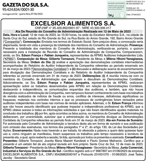 Excelsior Alimentos S.A. – Ata de Reunião – Publicidade Legal – Edição 07/06/2023