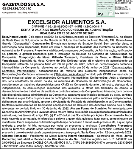 Excelsior Alimentos S/A – Extrato Ata de Reunião – Publicidade Legal – Edição 30/09/2022