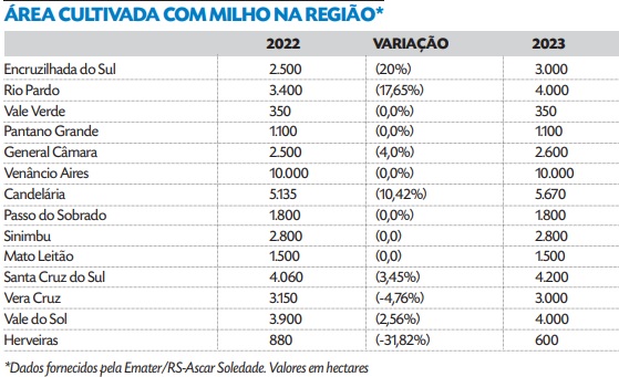 A cultura de milho terá o mesmo impacto do feijão no que se refere ao total de área cultivada na região da Emater de Soledade. O cultivo passará de 78.730 hectares para 73.475 hectares. No entanto, o engenheiro agrônomo Josemar Parise destaca que a produção deverá ser maior, em virtude do clima chuvoso.