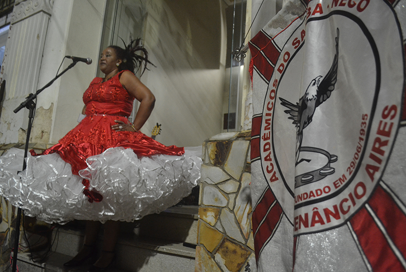 Bateria essa que há 25 anos vem embalando e dando ritmo ao bailado da porta-estandarte Sandra Helena da Rosa. Ela começou ainda criança nos desfiles de Carnaval, pois vem de uma família tradicional, que tem várias gerações dentro desse que é um dos principais Clubes Sociais Negros do Estado. Sandra há 25 anos atrás foi convidada pela professora e ativista, militante do Movimento Negro, Leonor Pinheiro de Sá a substituí-la como porta-estandarte da escola.