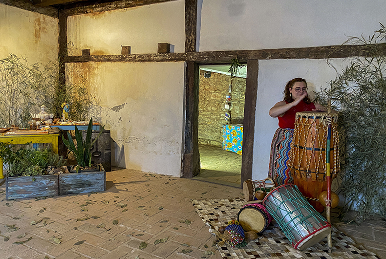 Outro espaço foi dedicado às religiões de matriz africana. A curadora chama a atenção para o esforço de adaptação que os escravos tiveram que fazer, uma vez que eram obrigados a praticar a religião católica, a mesma dos proprietários.