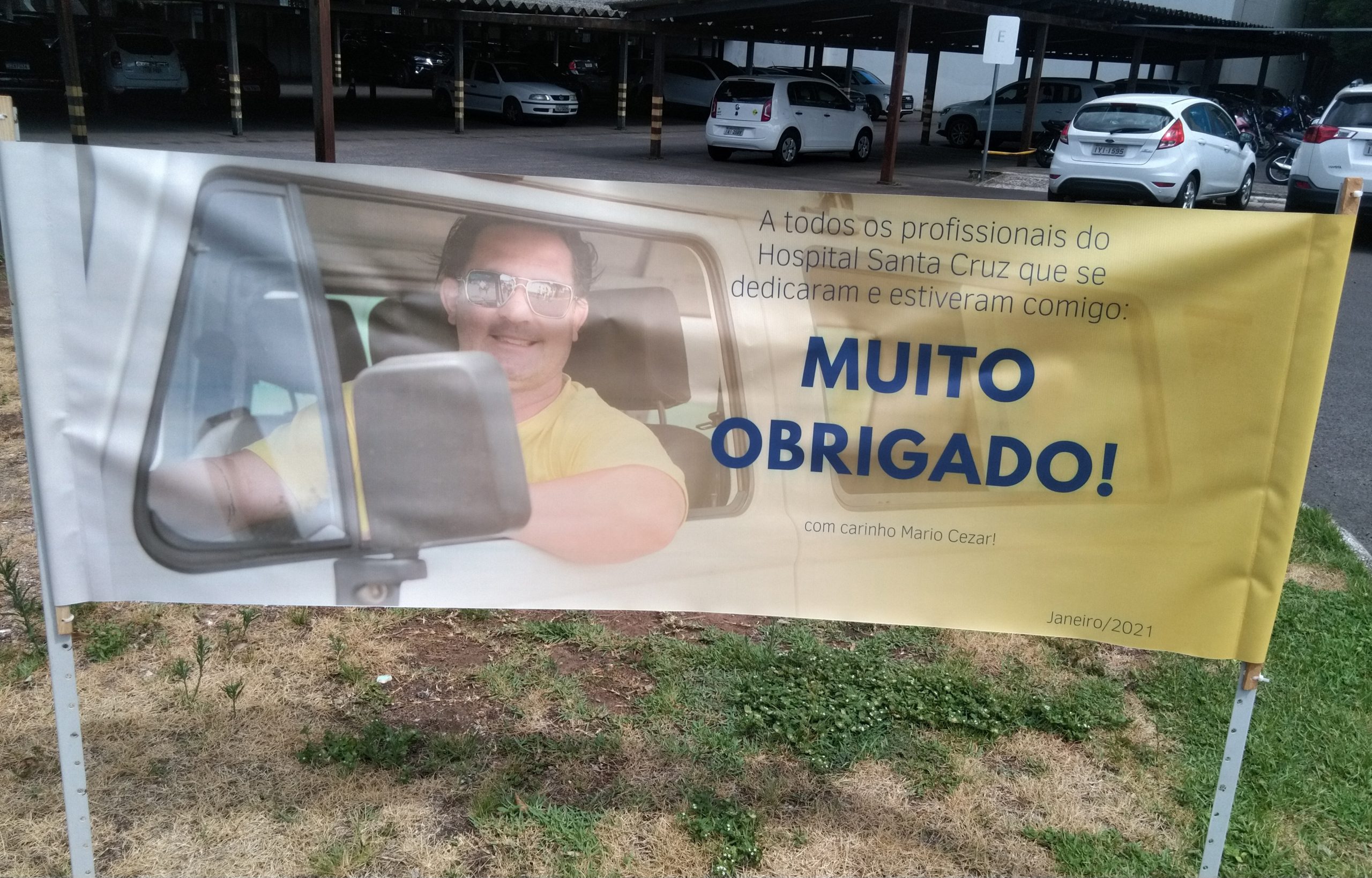 Mario Cezar, de 43 anos, foi internado no dia 21 de novembro e teve alta em 13 de janeiro. Ele ficou 36 dias na UTI. Com a frase “A todos os profissionais do Hospital Santa Cruz que se dedicaram e estiveram comigo. Muito obrigado! Com carinho Mario Cezar”, a faixa foi fixada em frente à portaria de entrada dos funcionários da instituição.