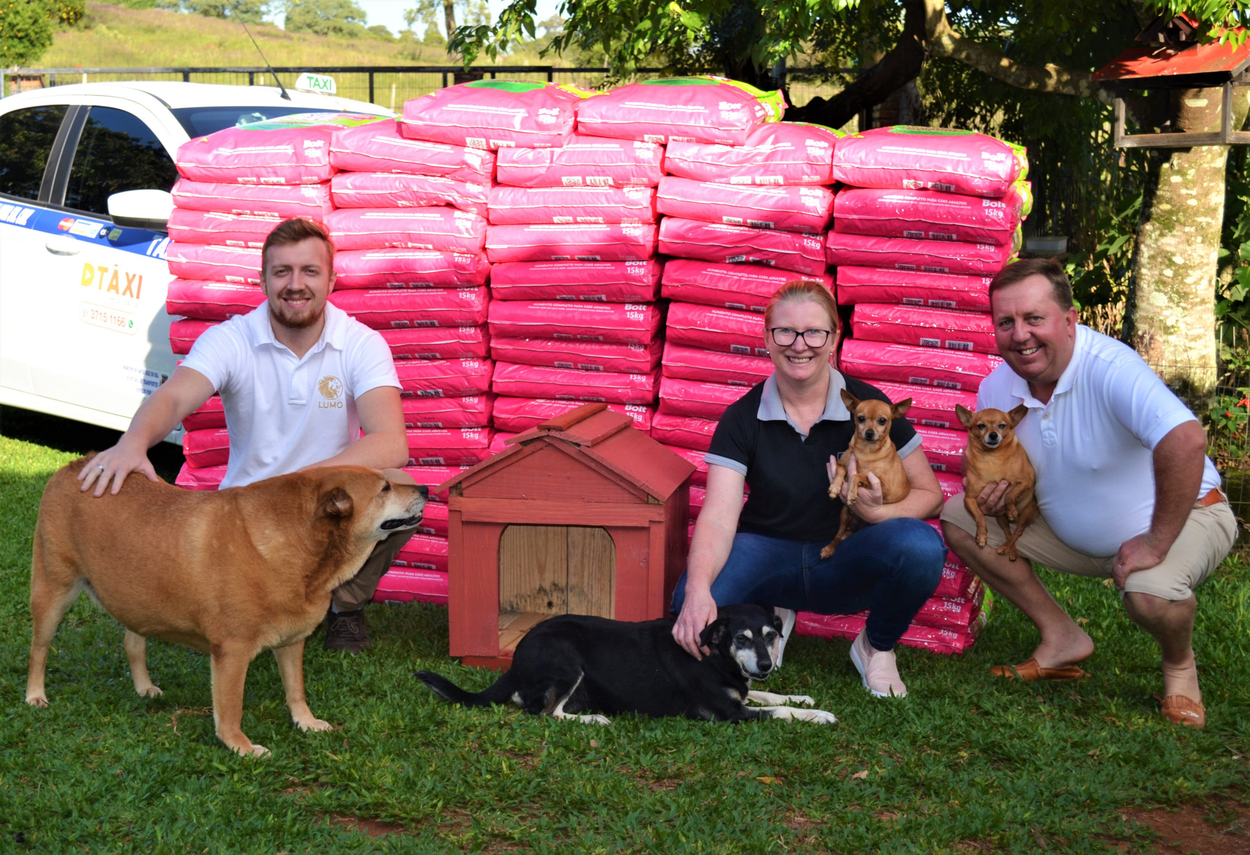 Esse montante é parte de um total de pouco mais de uma tonelada, em 67 sacos, adquirido por Vanderlei Marcos Schuh e Andreia Toillier Schuh, do Táxi Belvedere, Country, Nova Santa Cruz e João Alves; e o filho deles, Henry Marcos Schuh, da Lumo Energia Solar, em ação para contemplar os animais – os outros 495 quilos, em 33 sacos, serão entregues para ONGs de proteção animal.