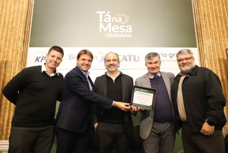 No Tá na Mesa, a Federasul homenageou a Associação Comercial e Industrial (ACI) Santa Cruz do Sul pela passagem dos 105 anos de trabalho em prol do desenvolvimento do município e região. Representaram a ACI os ex-presidentes Ario Sabbi (2016-2017) e Gabriel Haas de Borba (2020-2021), além do atual presidente Cesar Cechinato, que, na foto, estão ao lado do presidente da Federasul, Rodrigo Sousa Costa, e do vice-presidente de integração, Rafael Sittoni Goelzer.