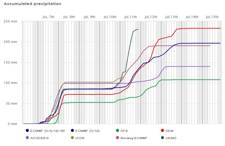 Na imagem abaixo é possível verificar as projeções de chuva dos oito principais modelos internacionais de previsão do tempo. Alguns chegam a estabelecer acumulados perto ou mesmo superiores aos 200 milímetros de precipitação em Santa Cruz até o meio da semana que vem.