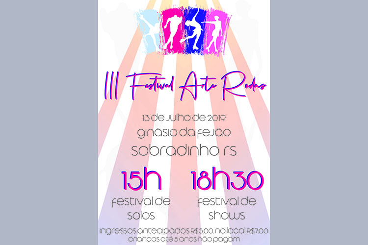 No próximo sábado, 13, o Arte Rodas traz até Sobradinho todo o encanto da Patinação Artística através da realização do 3º Festival Arte Rodas. Onde estarão participando grupos de Santa Cruz do Sul, Vale do Sol e Rio Pardo. A partir das 15h inicia o Festival de Solos e duplas; às 18:30 será a abertura oficial do evento seguida do Festival de Shows. O valor do ingresso antecipado é R$5,00 e pode ser adquirido com os patinadores, na hora o ingresso será R$7,00.