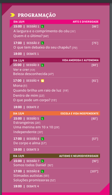 A programação conta ainda com debates e materiais didáticos divididos em quatro temas: Arte e Diversidade, Escola e Vida Independente, Vida Amorosa e Autonomia e Autismo e Neurodiversidade, além de um Guia de Aplicação de Recursos de Acessibilidade em Projetos Culturais.