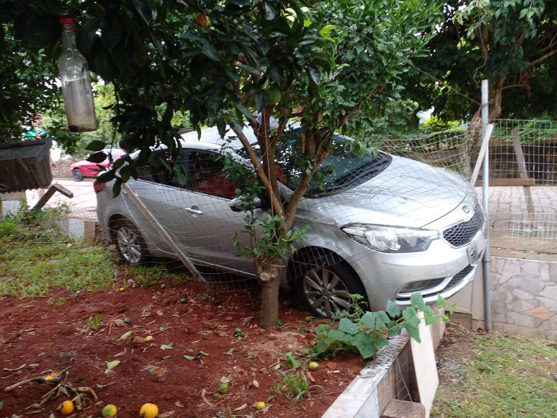 A proprietária do veículo não teria acionado corretamente o freio de mão. Uma árvore e um poste sustentados por um pedaço de ferro serviram de barreira para que o automóvel não invadisse a residência.