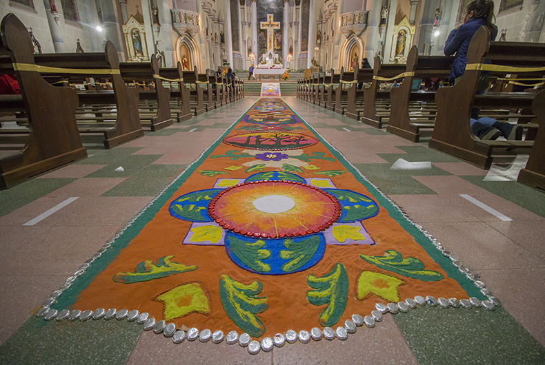 Neste ano, os tapetes ficam restritos ao interior da catedral, a fim de evitar maior movimentação de pessoas. As celebrações também acontecerão com limitação de público, os bancos terão demarcação de distanciamento e não haverá procissão. “Será uma pessoa por banco e cumpriremos todos protocolos de uso de máscara e de álcool em gel”, afirma Lucia.