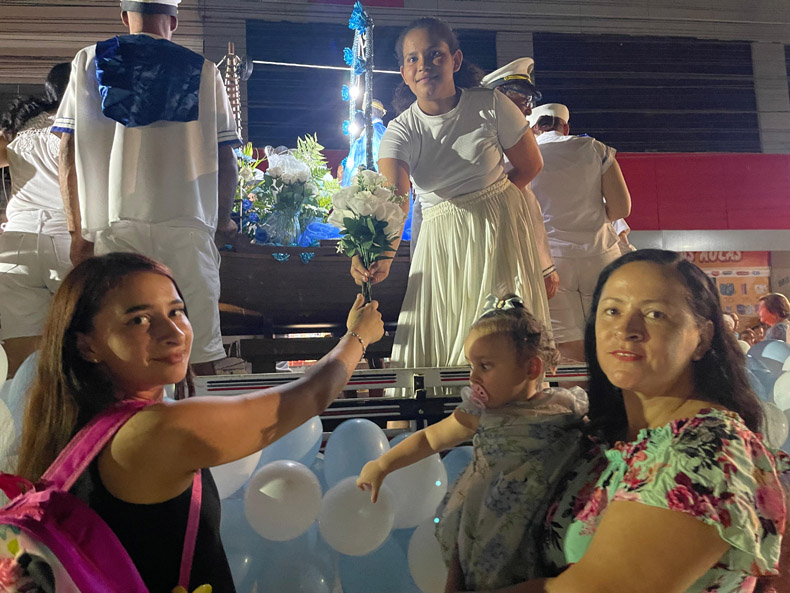 A babá Paula Barros, 45 anos, aguardava ansiosa a chegada de Iemanjá. A moradora do Bairro Guerino cultua há dois anos a Mãe das Águas. Acompanhada da filha Kethlin e da neta Ísis, todas munidas de ramalhetes de flores, Paula disse que o momento era de adoração e também de pedidos de proteção e saúde, principalmente para a neta. “Virei devota de Iemanjá há pouco mais de dois anos, justamente porque sempre peço por saúde para minha neta. Tenho muita fé nela.”
