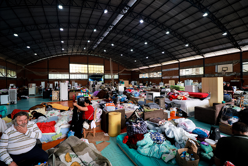 Trabalhamos na casa de um senhor chamado Luiz. Foi difícil fazer a limpeza porque a água chega com pouco volume nas torneiras. No dia da enchente, ele disse que não morreu por pouco. Ele, a esposa e dois filhos ficaram uma noite e quase um dia inteiro por cima dos móveis. A água chegou a 1,80 metro de altura dentro de casa. Ao lado da dele, mora a família da filha. A filha, inclusive, estava lavando a geladeira, na esperança de que, quando retornar a luz, ela volte a funcionar.