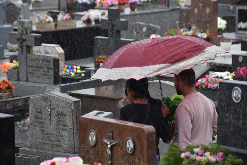 A manhã chegava ao fim quando o barulho dos trovões interrompeu o silêncio no Cemitério Municipal. E com eles, as primeiras gotas de chuva. Bastaram alguns minutos para um grande volume de água desabar do céu.